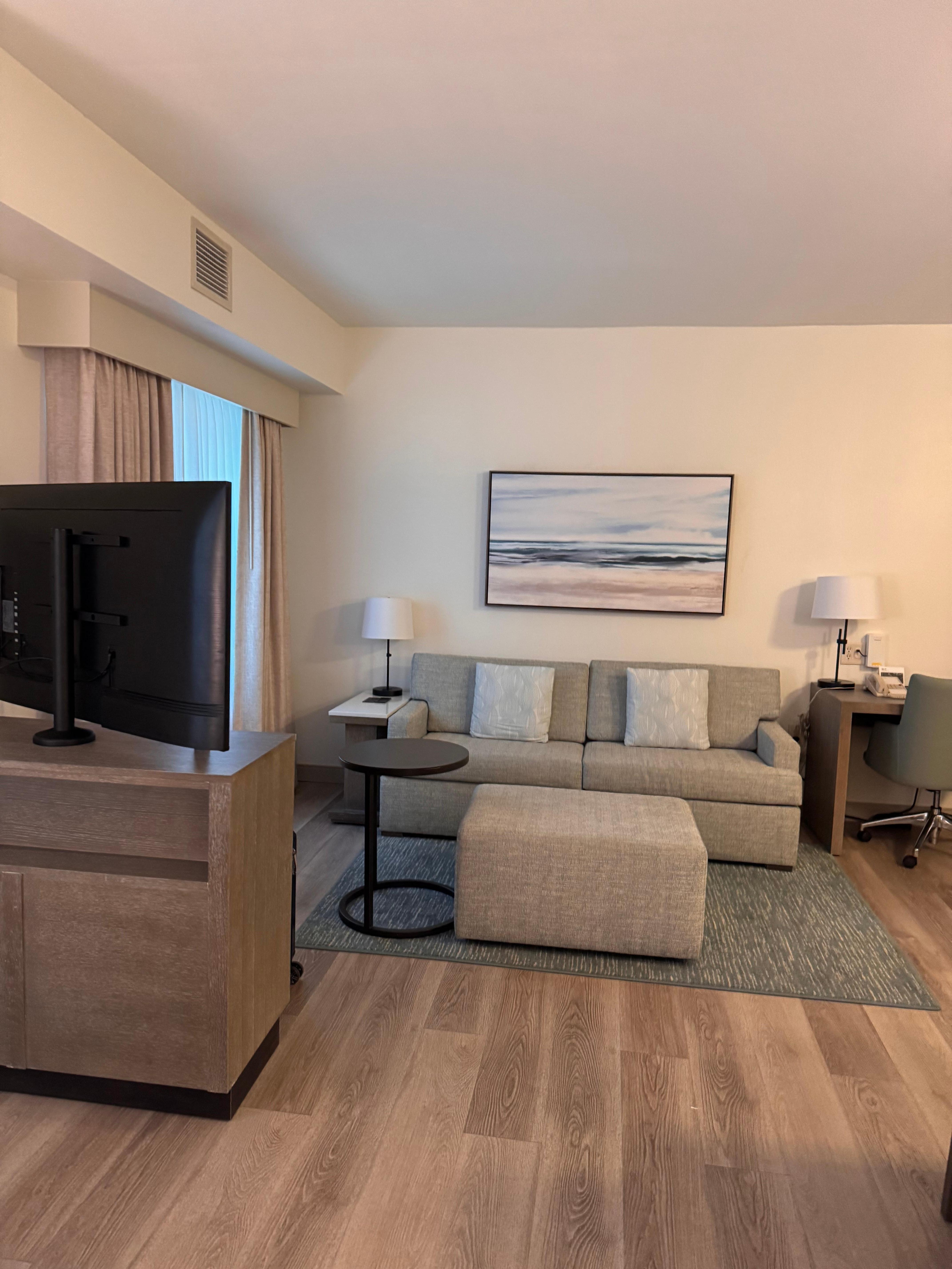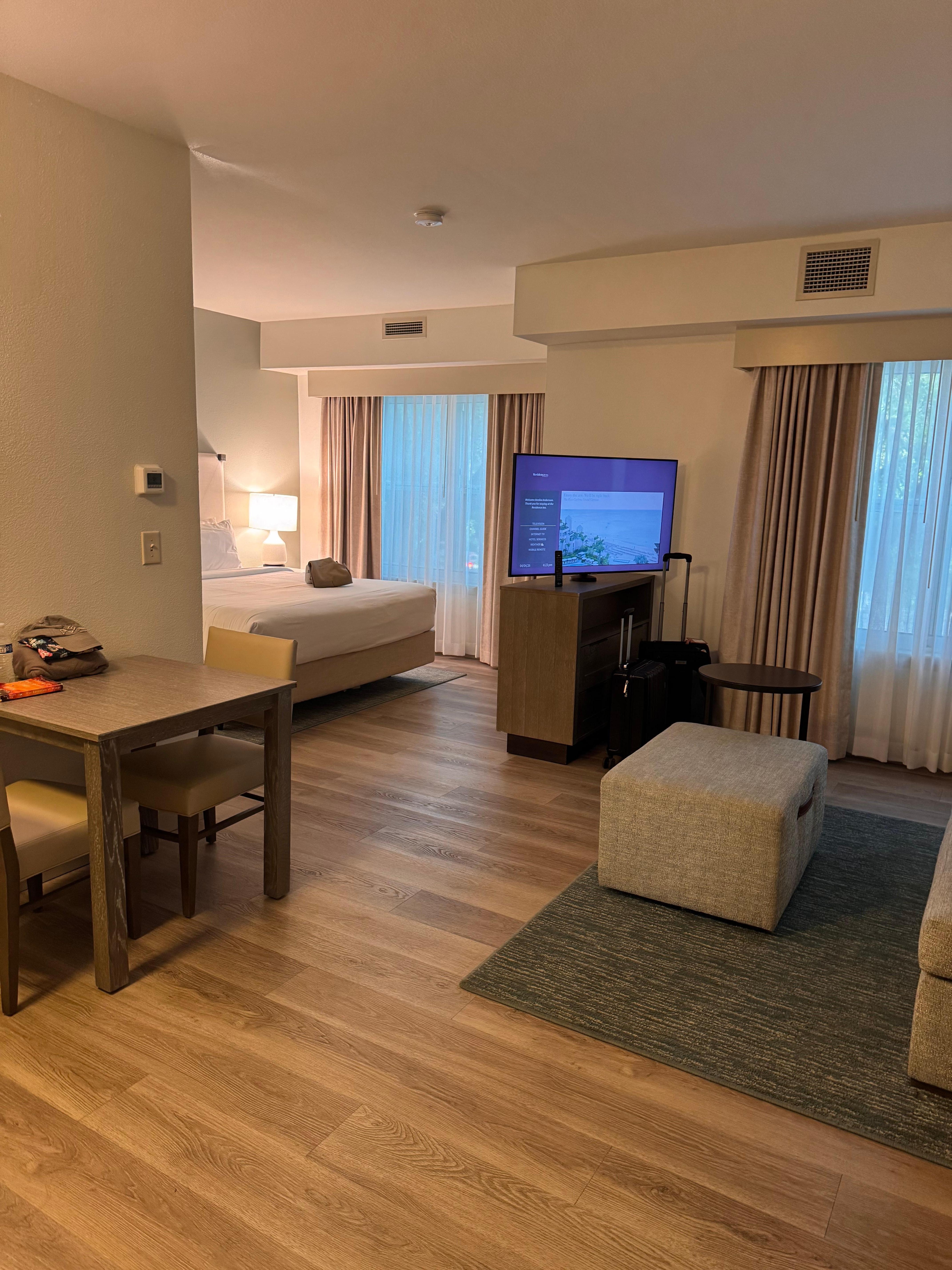 Loved this room and Hotel. I am never disappointed with Residence Inns and this one was superb in every way. The beds/pillows were extremely comfortable. It was very clean and well maintained. Great location, attentive staff, a hardy breakfast each day, and great laundry facilities. Topped off with a rarity nowadays for seniors... an easy to operate TV on which we easily added our favorite streaming service apps. Could not ask for more.