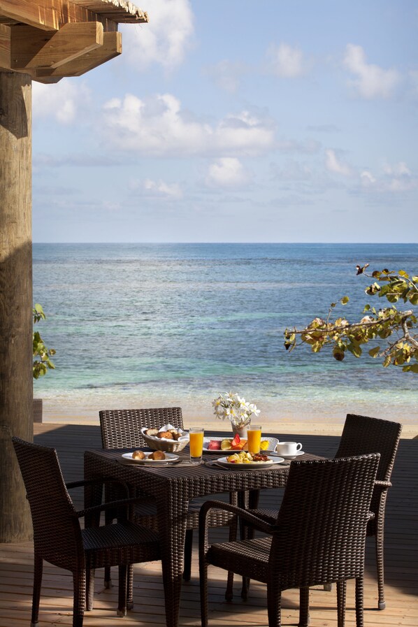 客人身着浴袍,躺在配有高档寝具的加厚床垫上,进入梦乡。每个带家具的露台均设有私人热水浴缸。