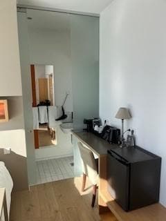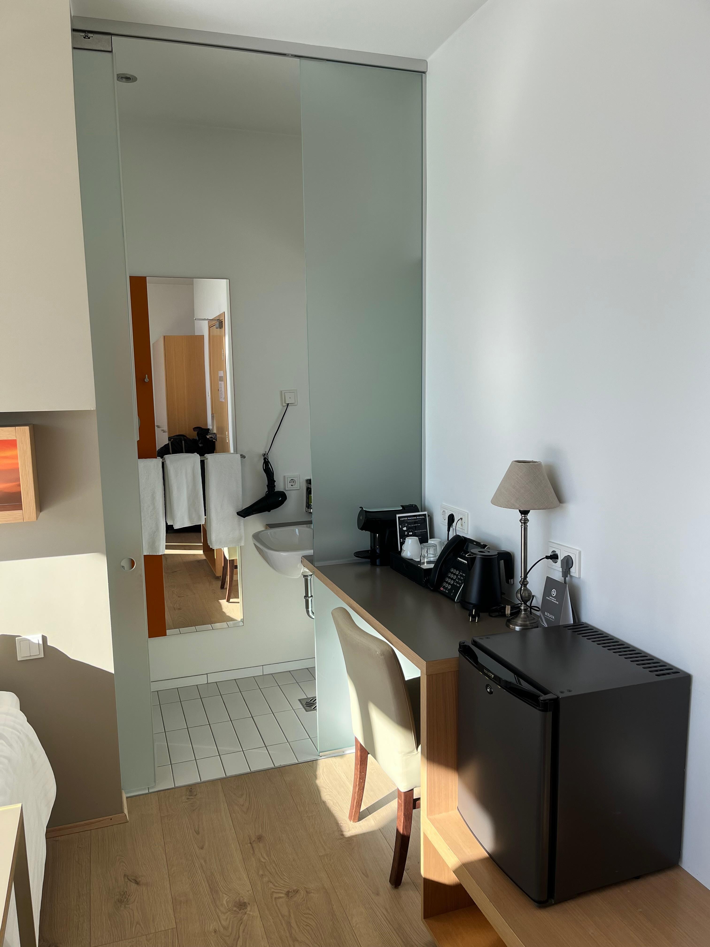 Small seating area with a TV, we found ourselves moving the coffee table and the table at the end of the bed to avoid bumping into them in the dark if using the toilet — the room layout could perhaps be improved. The most unusual design choice was the bed being positioned against the wall right next to the toilet area, which is separated only by a glass sliding door that doesn’t fully close. This means every sound from the toilet area is very clearly heard in the bedroom - not ideal! There are no sockets either side of the bed, whereas the opposite wall has them — another reason the bed might be better placed the opposite end of the room. No safe in the room either,