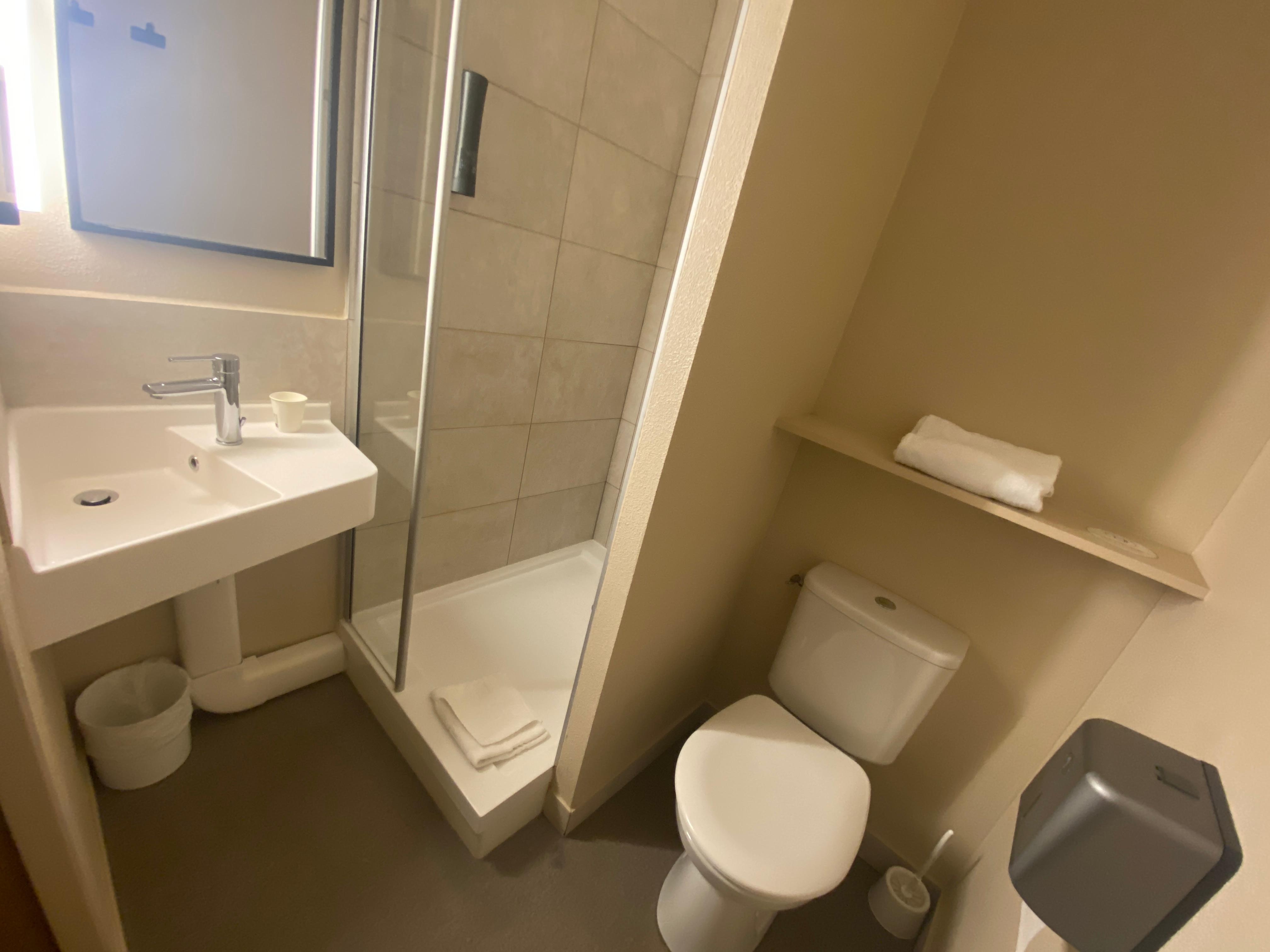 Chambre au RDC côté rue, bruyante, chambre PMR salle de bain avec moisissure, petit déjeuner moyen, pain pas frais, pote de confiture et pâte à tartiner vide…